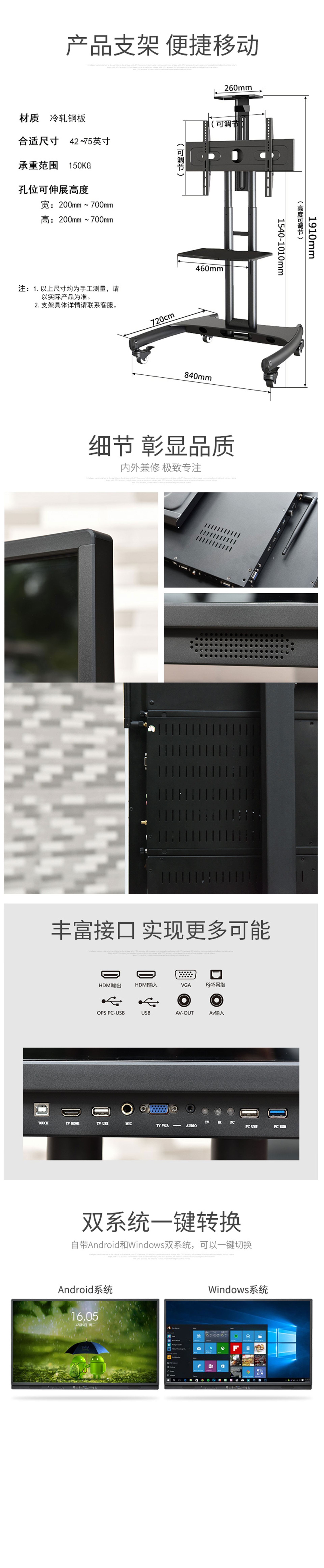 多種尺寸交互式多媒體會(huì)議教學(xué)─體機(jī)原裝液晶面板,分辨率3840*2160,型材面框,紅外10點(diǎn)觸摸,高透白鋼化玻璃,預(yù)留OPS接口,支持安卓/電腦雙系統(tǒng),安全一體化設(shè)計(jì),鋁合金外框,圓弧角防撞傷設(shè)計(jì);機(jī)器面框前置式圓鈕輕觸按鍵,按鍵具有一鍵節(jié)能、一鍵開關(guān)機(jī)、一鍵開啟電腦、一鍵切換信源功能。